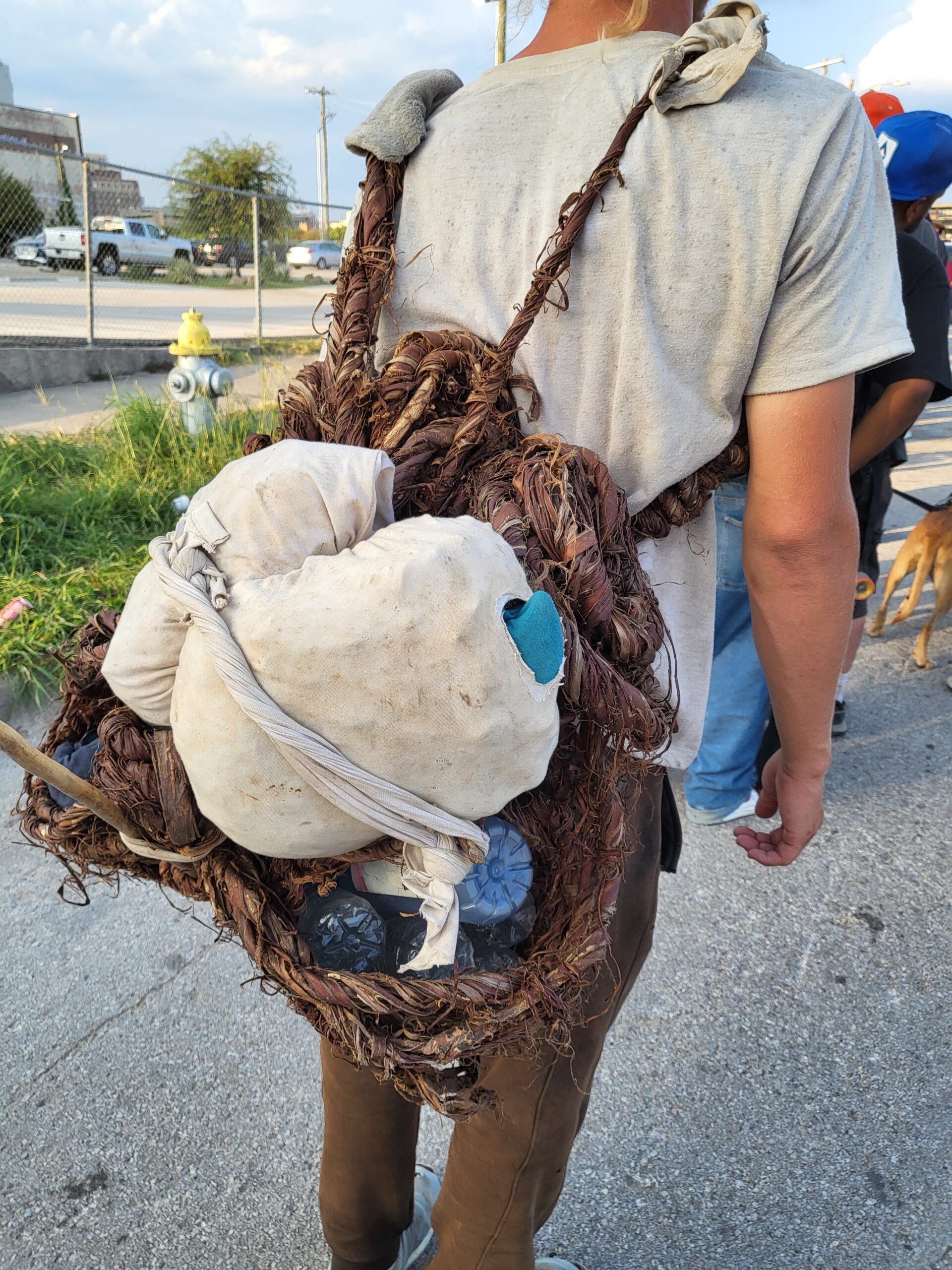 We recently encountered one of God's Concrete Angels that had made his own backpack out of tree branches and twigs. God's Concrete Angels have to learn to be very creative and resourceful with what little they have to carry with them along their journey. God Bless Them All!